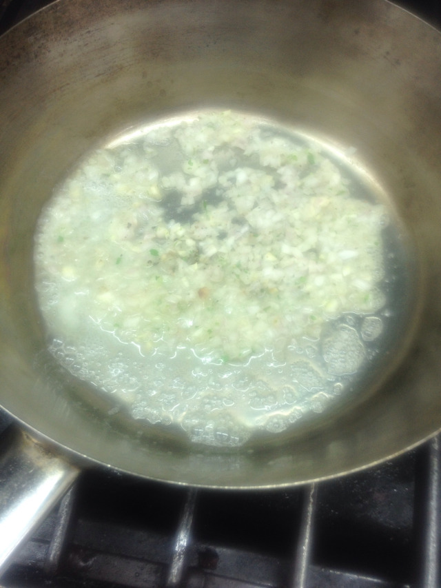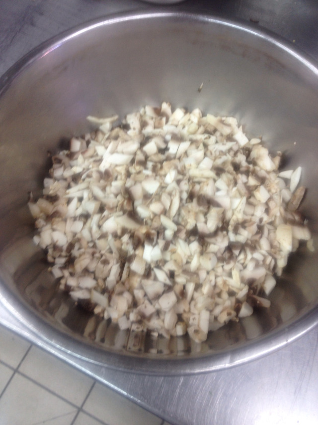 We sautéed two finely chopped shallots in a little butter (you can replace the shallot with onion, red onion, scallions), then added around 400g of button mushrooms chopped to classic brunoise size.