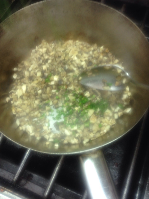 We mixed it well and added a little salt and pepper (salt eliminates a little liquid from the mushrooms, and in this case that is desired—similarly, adding salt, when possible always preferred at the start of a recipe, especially with soups and sauces—it is better absorbed and better develops the taste of the dish).